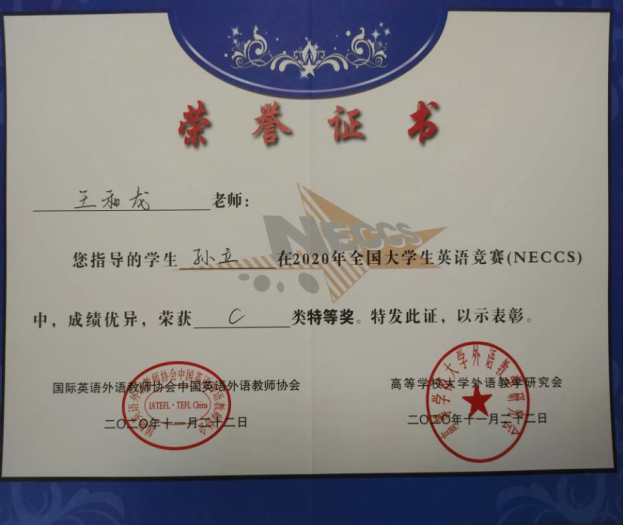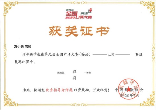 教師指導學生獲“外教社杯”長三角區域高校學生跨文化能力大賽暨全國邀請賽(江蘇省賽區)特等獎;2020年全國大學生英語競賽決賽特等獎4項,其中A類一項,B類一項,C類二項,取得了歷史最好成績;2020年“外研社·國才杯”全國英語演講比賽、閱讀比賽及寫作比賽三等獎各1項;億學杯全國商務英語競賽全國賽三等獎1項,江蘇賽區特等獎1項;2人分別獲第九屆全國口譯大賽江蘇賽區復賽一等獎和二等獎;學院本科生考研率24.56%,比上一年度增長0.75%。