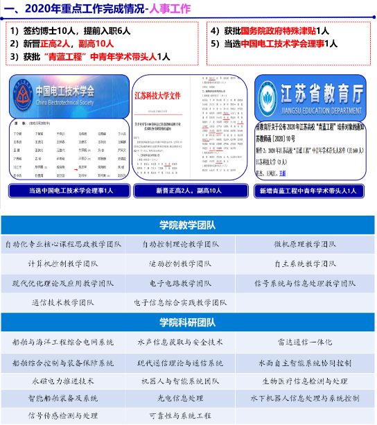 2020年,電子信息學院圍繞學校建設“國內一流造船大學”的戰略目標,緊跟學校工作部署,以高層次人才培養和引進為突破,以教學科研團隊建設、重點重大項目和成果培育為抓手,以立德樹人、大學生核心素質提升為重要建設內容,抓重點、攻難點、創亮點,深化教育教學融合,全面提升人才培養質量。