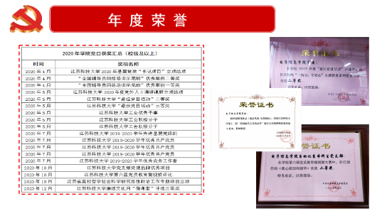堅持黨的全面領導,堅持從嚴治黨,以辦“和諧學院”、筑“溫暖黨組織”、創新爭優為目標,全面推進思政建設、黨風廉政建設、基層黨組織建設及文化建設。完成黨委換屆,優化了基層黨組織設置。電子系教工支部獲校級優秀基層黨組織稱號。圓滿完成巡察工作,課程思政工作持續進行、平穩過渡到新校區,教師滿意率高!有力推動了學院紅色陣地建設。在新校區學院大樓建設了黨建活動室、支部書記工作室、統戰辦公室、工會活動室等。獲先進基層黨支部、優秀黨員、優秀黨務工作者、黨建品牌優秀、黨員教育微視頻和最佳黨日獎項,江蘇省高校哲學社會科學研究思想政治工作專題項目立項等校級及以上榮譽10余項。