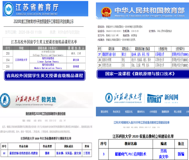 堅持“以本為本”,把人才培養的質量和效果作為檢驗一切工作的根本標準。堅持依托行業、特色辦學,以工程專業認證為抓手,積極探索本科生創新、工程能力培養體系構建、專業核心課程體系改革、人才培養方案重構、分類培養模式探索和校企協同育人。獲批國家一流課程1門,省一流課程1門,省留學生全英文授課省精級品課程2門。新增省重點教材1部,省微課教學三等獎1項。獲教育部產學合作協同育人項目1項。獲省優秀本科畢業設計一等獎、二等獎、三等獎各1項,省優秀本科畢業設計團隊1個。獲批江蘇省研究生科研創新計劃項目和研究生實踐創新項目21項。水聲工程通過新專業評估,完成自動化、電子信息工程2個專業的認證自評報告。國家級教學成果獎培育:總結撰寫“鑄大國重器 育一流人才 —— 卓越船舶工程師培養的江蘇科技大學實踐”。成立了11個教學團隊—— 依托團隊開展教學改革研究,課程思政建設。