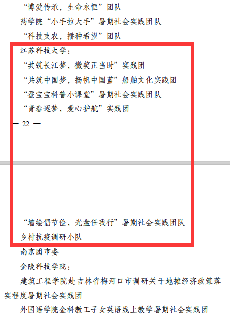 近日,中共江蘇省委宣傳部、江蘇省文明辦、江蘇省教育廳、共青團江蘇省委和江蘇省學生聯(lián)合會聯(lián)合下發(fā)了《關(guān)于公布2020年全省大中專學生志愿者暑期文化科技衛(wèi)生“三下鄉(xiāng)”社會實踐活動先進集體和個人名單的通知》,我校在該活動中獲多項榮譽:江蘇科技大學團委榮獲“先進單位”稱號;“共筑長江夢,微笑正當時”實踐團等7支團隊榮獲“優(yōu)秀團隊”稱號;蔡志尚等8位同學榮獲“先進個人”稱號;卜江春等6位老師榮獲“先進工作者”稱號;溧陽市戴埠中心小學榮獲“優(yōu)秀社會實踐基地”稱號;《“喜迎建黨一百周年”暑期社會實踐活動》《扶貧先扶志,泗陽助夢行》榮獲“優(yōu)秀調(diào)研報告”稱號。