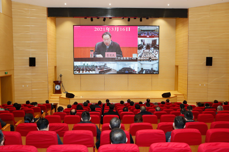 3月16日下午,學(xué)校在鎮(zhèn)江長山校區(qū)行政樓100號報告廳和張家港校區(qū)行政樓603會議室設(shè)立分會場,組織參加全省教育系統(tǒng)黨史學(xué)習(xí)教育動員視頻會議,校領(lǐng)導(dǎo)班子成員、處級以上黨員干部參加了會議。