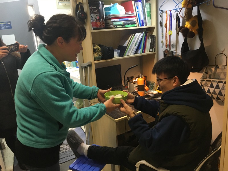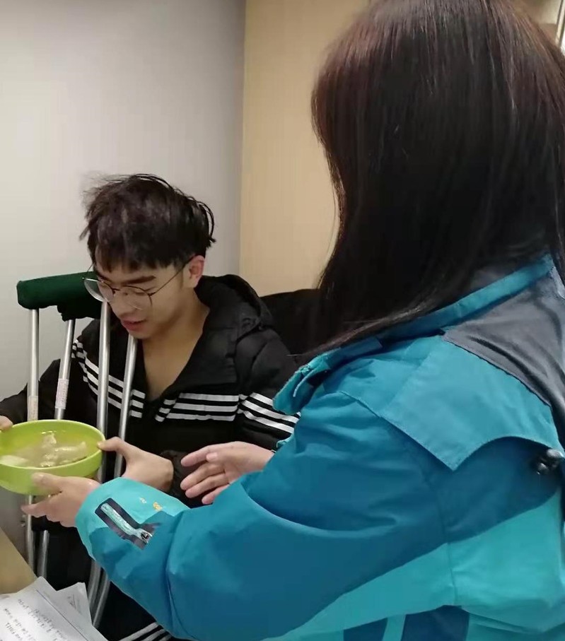 王民杰是2019級生物工程專業學生。打球不小心傷到了腿拄起了拐杖后,他從門口進去的時候被宿舍阿姨看到了。“我也沒太在意,因為我們一棟宿舍樓有上千人,我以前一直認為這么多人宿管阿姨只能做到最基礎的查按時歸寢,但是讓我沒有想到的是宿管阿姨不僅能記到我的寢室號,還能記得我是生物技術學院的學生。當阿姨查寢的時候給我端了一碗蘿卜排骨湯過來,我心里既驚訝又感動,宿管阿姨叫我好好休息,并且還很溫柔的沒有扣我衛生分,說我受傷了不方便收拾,十分的有人情味。” 2018級生物工程專業的門建煒介紹,當時阿姨第一時間詢問自己的病情,第二天一早端著連夜煲的愛心排骨湯來到宿舍慰問,還說“剛剛給你熱好了,你快趁熱吃,明天我繼續熱好了給你拿過來,這段時間你就好好養傷,有什么不方便的及時和阿姨講”。阿姨叮囑讓身處異地的門建煒感受到了無微不至的關懷。“就像媽媽一樣,和藹可親,細心周到,對我關照有加,一次次幫助,一次次呵護。在返校的這段日子里,阿姨也不辭辛勞定期關心我的康復情況,多次囑咐我,天氣變化無常,注意腿部保暖。為了表達心中的感謝之情,我們送錦旗給阿姨,更是為了讓身邊同學了解到阿姨默默不聞、體貼入微照顧,將每位同學當作自己孩子一樣照顧的良苦用心。”