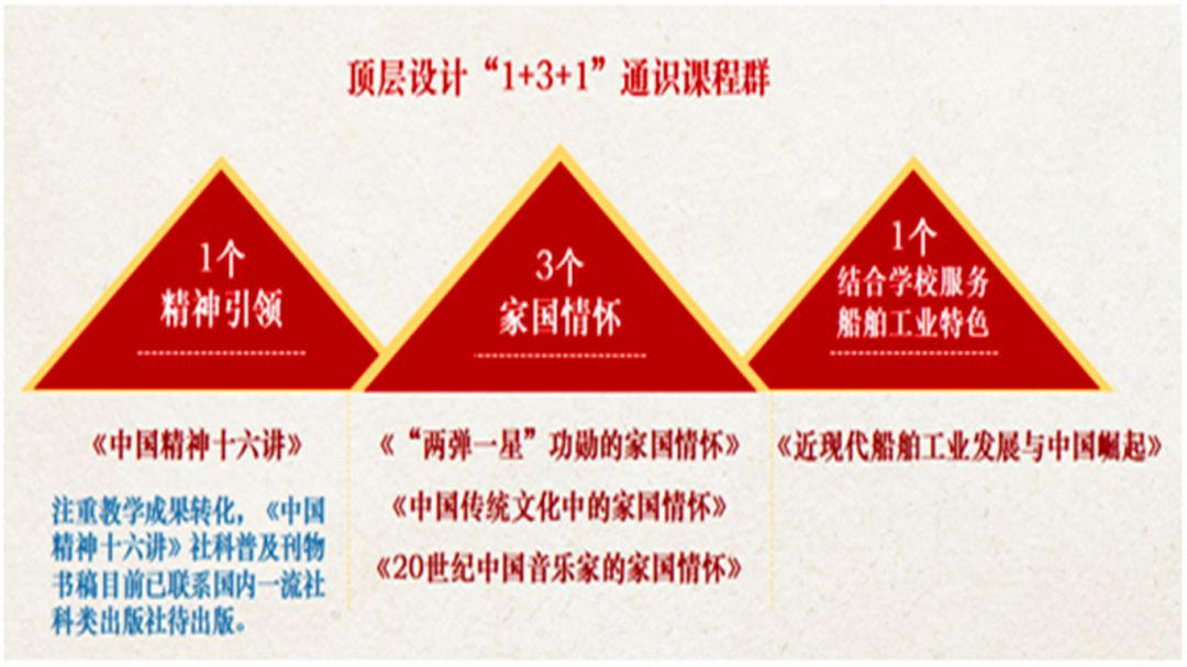 “思政課程”與“課程思政”共建共進(jìn)。一是加強(qiáng)思政課程建設(shè),持續(xù)推動習(xí)近平新時代中國特色社會主義思想“三進(jìn)”。思政課程均獲課程教學(xué)項目立項且于2020年結(jié)題,申請各類教研教改項目10項,教師教研教改積極性顯著提升;二是探索“課程思政”新路徑,與環(huán)化學(xué)院簽訂“課程思政”結(jié)對共建協(xié)議;三是創(chuàng)新開設(shè)思政選修課,頂層設(shè)計“1個精神引領(lǐng)、3個家國情懷、1個結(jié)合學(xué)校服務(wù)船舶工業(yè)特色”的“1+3+1”通識課程群。