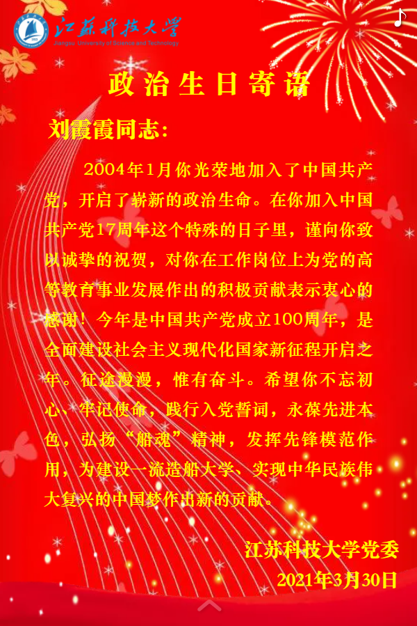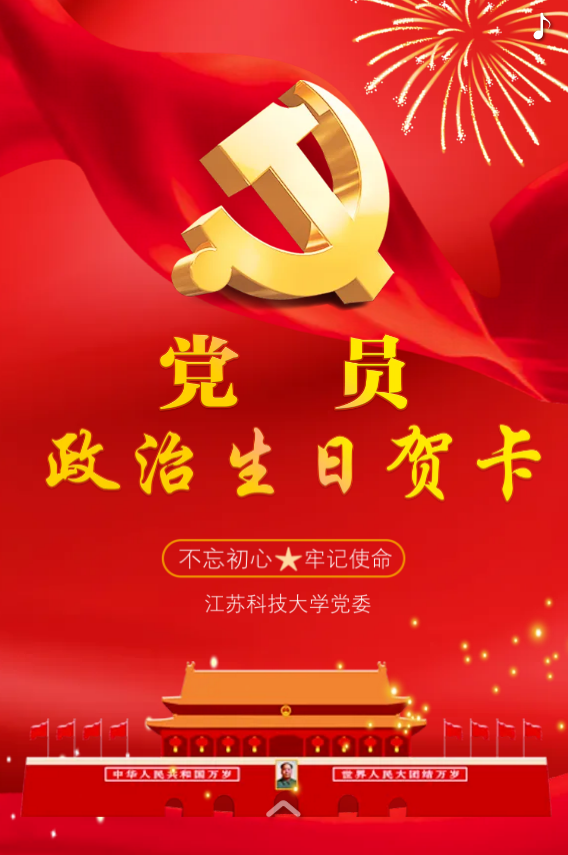 每名黨員有兩個生日,一個是自然生日,一個是政治生日;一個昭示著生命的開始,一個代表著在黨的初心。為了引導黨員同志不忘自己的“第一身份”,發揮先鋒模范作用,江蘇科技大學在全面啟動黨史學習教育的同時,梳理健全了4000多名黨員政治生日臺賬,準確掌握每名黨員的政治生日信息,精心制作了“政治生日賀卡”。在內容上,入黨誓詞、學校黨委的衷心祝福和殷切希望都被印制在這張特殊的生日賀卡上;在形式上,融入校歌音樂、中國共產黨黨員成立100周年標識、不忘初心、牢記使命等元素;在接收方式上,支持電腦、手機、微信、QQ接收。從2021年3月開始,每月定時向黨員推送政治生日賀卡,其中12月份將有1100多名黨員同志過政治生日。