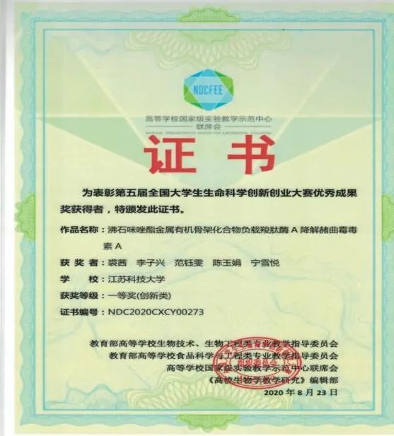 獲第五屆全國大學生生命科學創新創業大賽一等獎 2 項、二等獎 1 項;第四屆江蘇省大學生食品科技創新創業大賽獲優秀獎;“智能糧倉”創業項目入圍學校“互聯網+”的競賽行列。