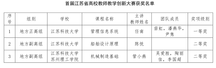 近日,首屆江蘇省高校教師教學創新大賽(本科)在江南大學召開。我校榮獲一等獎1項,二等獎2項。
