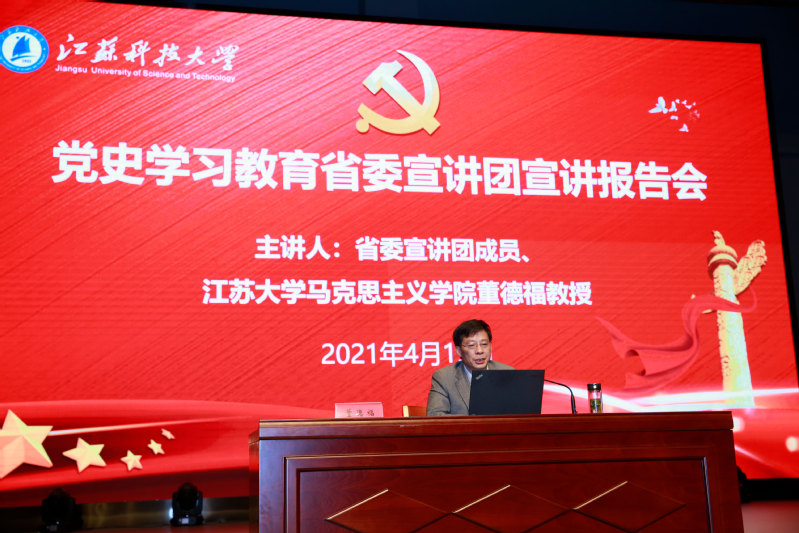 4月19日下午,黨史學習教育省委宣講團在江蘇科技大學進行宣講,省委宣講團成員、江蘇大學馬克思主義學院教授董德福作宣講報告。本次宣講報告主會場設在長山校區船苑劇場,分會場設夢溪校區演講廳和張家港校區、蘇州理工學院文心會堂。校領導周南平、景旭文、許俊華、俞孟蕻、鄭培鋼、嵇春艷出席報告會。全校科級以上干部、馬克思主義學院全體教師、全體輔導員、學生黨員、入黨積極分子等聆聽宣講報告。黨委常委、副校長湯建主持宣講報告。