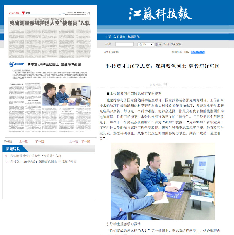 他主持參與了國家自然科學(xué)基金項目、國家武器裝備預(yù)先研究項目、工信部高技術(shù)船舶項目等前沿基礎(chǔ)科學(xué)研究與重大科技攻關(guān)任務(wù)10余項,發(fā)表高水平學(xué)術(shù)研究成果30余篇。每攻克一個科學(xué)難題,他都會選擇一張最具有代表性的模型圖作為電腦屏保,目前已經(jīng)攢下十余張這樣有特殊意義的“屏保”。“已經(jīng)把這個問題攻克了,那么下一個突破點在哪呢?”身為“90后”教授、“先鋒90后”青年黨員,江蘇科技大學(xué)船舶與海洋工程學(xué)院教授、研究生導(dǎo)師李志富風(fēng)華正茂。他喜歡和學(xué)生交流,熱愛科研事業(yè),從生命的深處仰望世界努力攀登,期待“攻破一道道難關(guān)”。
