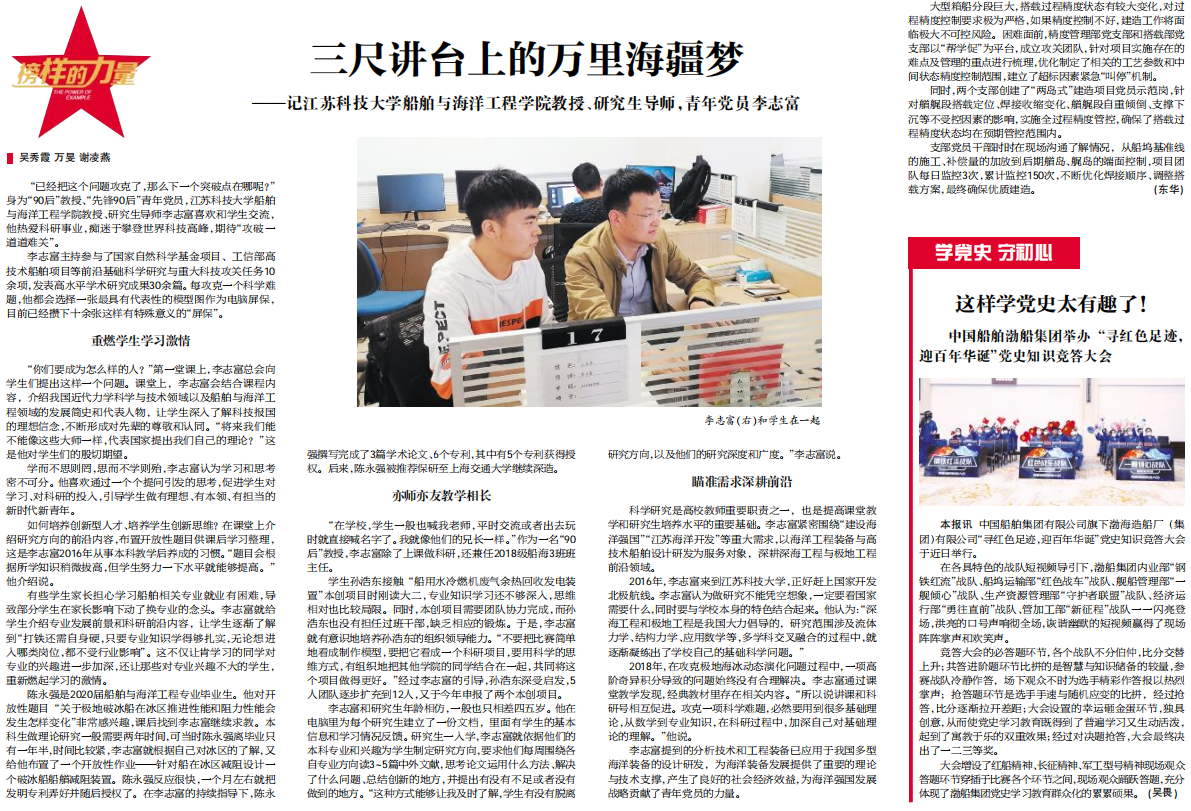 “已經(jīng)把這個(gè)問題攻克了,那么下一個(gè)突破點(diǎn)在哪呢?” 身為“90后”教授、“先鋒90后”青年黨員,江蘇科技大學(xué)船舶與海洋工程學(xué)院教授、研究生導(dǎo)師李志富喜歡和學(xué)生交流, 他熱愛科研事業(yè),癡迷于攀登世界科技高峰,期待“攻破一道道難關(guān)”。李志富主持參與了國(guó)家自然科學(xué)基金項(xiàng)目、工信部高技術(shù)船舶項(xiàng)目等前沿基礎(chǔ)科學(xué)研究與重大科技攻關(guān)任務(wù)10余項(xiàng),發(fā)表高水平學(xué)術(shù)研究成果30余篇。每攻克一個(gè)科學(xué)難 題,他都會(huì)選擇一張最具有代表性的模型圖作為電腦屏保,目前已經(jīng)攢下十余張這樣有特殊意義的“屏保”。