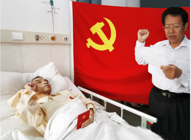 2010年6月13日早上七點多,時任學校組織部長的韓光范帶著吳強驅車到鎮江市第三人民醫院腫瘤治療科病房,看望景榮春教授。推開門,景教授消瘦臉龐映入眼前,與病魔作斗爭的勇氣和堅毅執著的眼神讓吳強“記憶深刻,歷歷在目”。當景教授在黨旗前握拳莊嚴宣誓“我志愿加入中國共產黨.......”時,他微弱顫抖的聲音讓吳強震撼不已,“握著相機的手都有些顫抖”。景榮春教授在病榻前、在生命最后階段實現個人崇高理想,那一瞬間的影像永遠凝聚在吳強的視界中,鐫刻進他的心里。