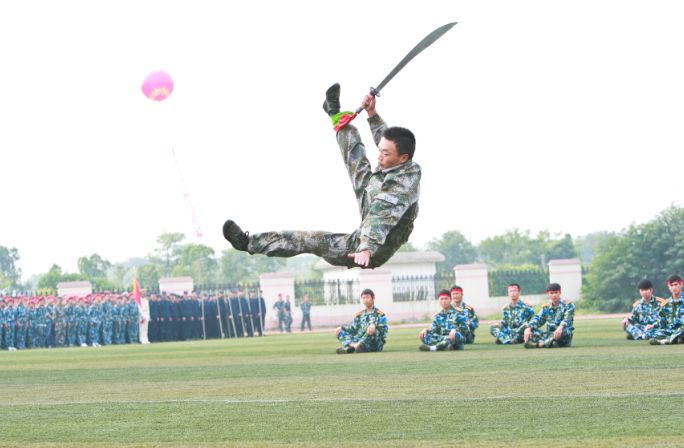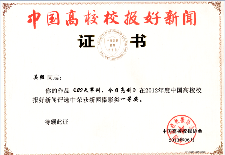 2012年9月28日,東校區軍訓演練大操場,曾經數次拍攝軍訓演練的吳強經歷了最有“神”的時刻。當天,大學生表演劍術時,騰躍輕盈如燕,刀劍氣勢如虹?!霸谖覕z影的潛意識里,預感到能出一張精彩的好片子,腦海中已經預設好畫面的大致效果。”吳強走到舞劍學生的左側,相機貼近地面,等待最佳瞬間出現。當學生劍舞騰空的剎那,吳強連拍數張,定格了最美的身姿。畫面中生動活潑的舞劍形象很好的表述了大學生英勇果斷,敢于亮劍思想主題,這幅作品在年度全國高校好新聞評比中榮獲一等獎。