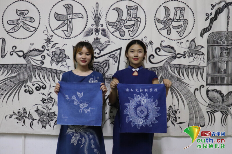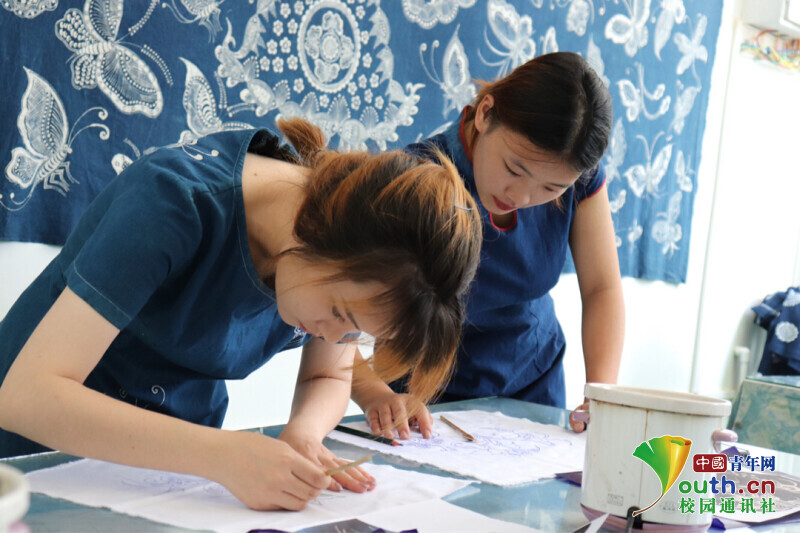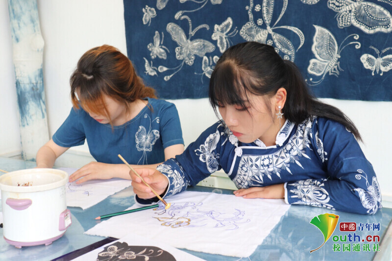 實踐團隊主要通過“直播+線下采訪”的形式,學習宣傳苗族蠟染非物質文化遺產,并邀請老師和學生參與其中。31日上午首先由苗族蠟染非物質文化遺產傳承人楊而報浪老師線上為大家展示蠟染的過程。老師介紹到:蠟染即用蠟刀蘸熔蠟繪花于布后以藍靛浸染,既染去蠟,布面就呈現出藍底白花或白底藍花的多種圖案,同時,在浸染中,作為防染劑的蠟自然龜裂,使布面呈現特殊的“冰紋”,尤具魅力。直播過程中,老師著重講解了蠟染制作過程中的上蠟和浸染中的環節:在上蠟的時候,必須用加熱器把蜂蠟保持在液體的狀態,避免蜂蠟由于溫度過低而冷卻成固體。在浸染的時候必須長時間將上好蠟的布料浸染在染缸里面,并且不停的移動布料,這樣的效果最佳。蠟染藝術在古代時期稱之為蠟纈,是一種古老而獨特的傳統印染藝術之一;它與絞纈(扎染)、夾纈(鏤空印花)并稱為中國古代三大印花技藝。蠟染藝術的印染歷史中源遠流長,歷史悠久。在楊而報浪老師的解說下,實踐團成員們了解到苗族蠟染被稱為古代三大印花工藝,苗族婦女蠟繪,圖案設計只憑構思繪畫,也不用直尺和圓規,便可流暢畫出圖案。苗族蠟染的圖案主要是以自然紋為主,自然紋以自然界中的花鳥魚蟲做素材,隨心所欲地創作成別致的圖案,造型生動,栩栩如生,其中鳥的變化最為豐富。隨著苗族蠟染的繁榮和發展,現在的苗族蠟染圖案也可以加入一些現代化元素,將苗族蠟染藝術成品制作成為玩偶、香包、手提包等等。在直播結束后,苗族蠟染非物質文化遺產傳承人龍鹿老師帶著兩位實踐團成員親自感受上蠟與浸染以及脫蠟的整個過程。隨著親手接觸這些環節,實踐團成員楊仁紅有感而發:“苗族蠟染技藝的巧奪天工、成品的精美絕倫令人十分驚嘆,作為當代青年大學生應該努力學習,要為宣傳和傳承非物質文化遺產貢獻自己的力量。”