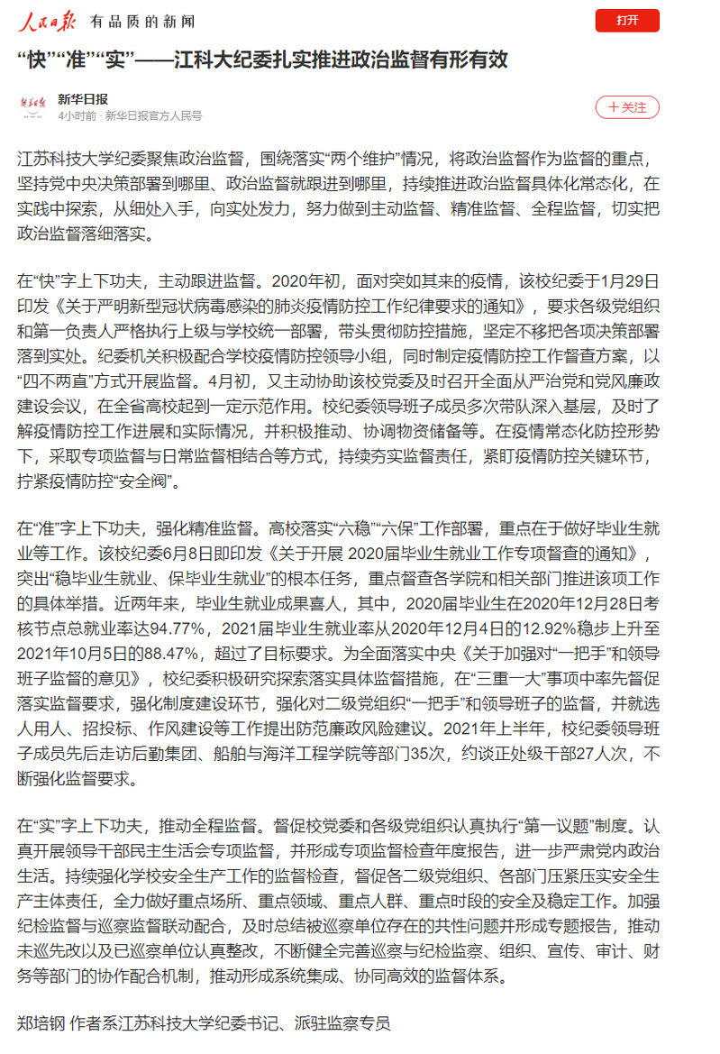 江蘇科技大學紀委聚焦政治監督,圍繞落實“兩個維護”情況,將政治監督作為監督的重點,堅持黨中央決策部署到哪里、政治監督就跟進到哪里,持續推進政治監督具體化常態化,在實踐中探索,從細處入手,向實處發力,努力做到主動監督、精準監督、全程監督,切實把政治監督落細落實。