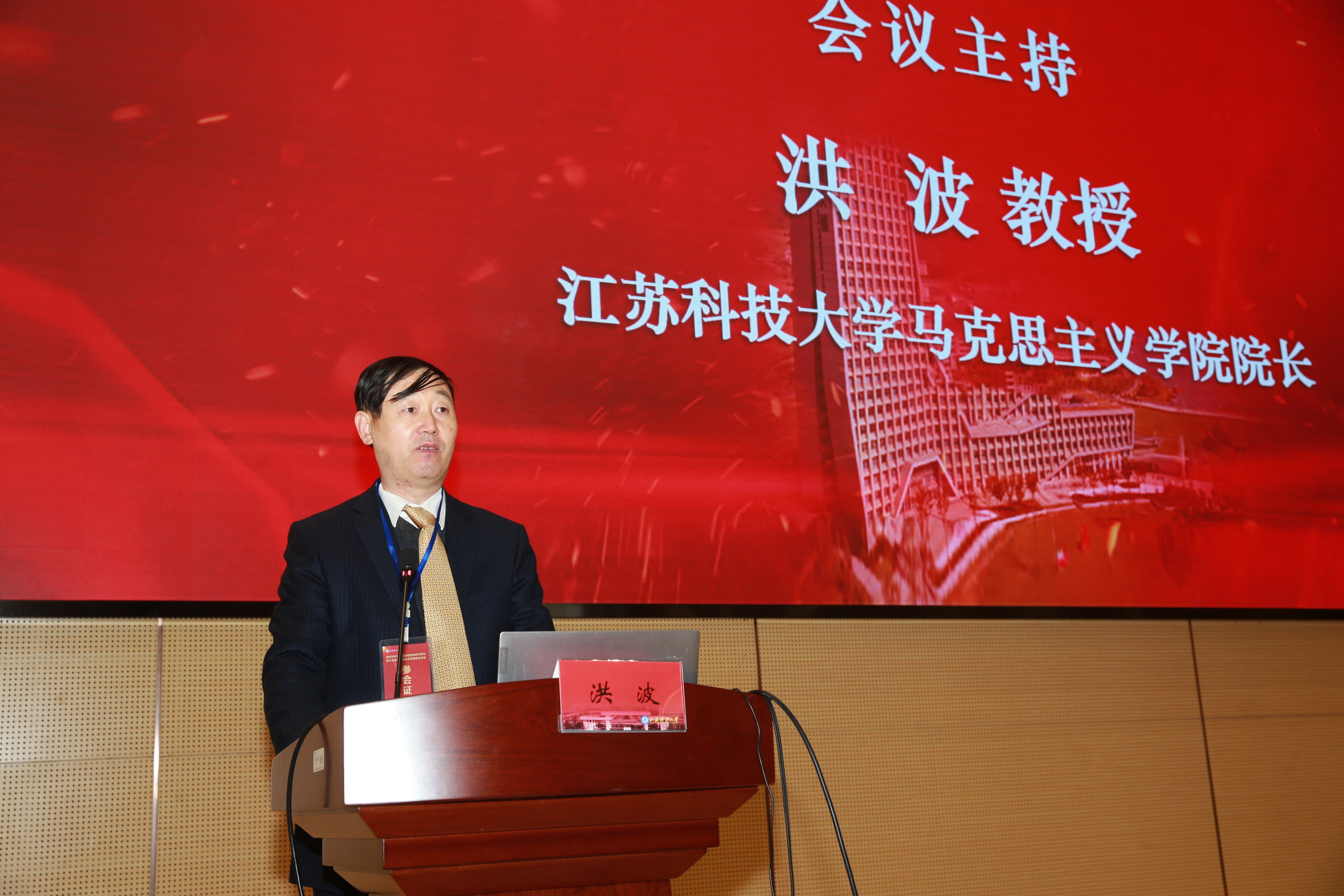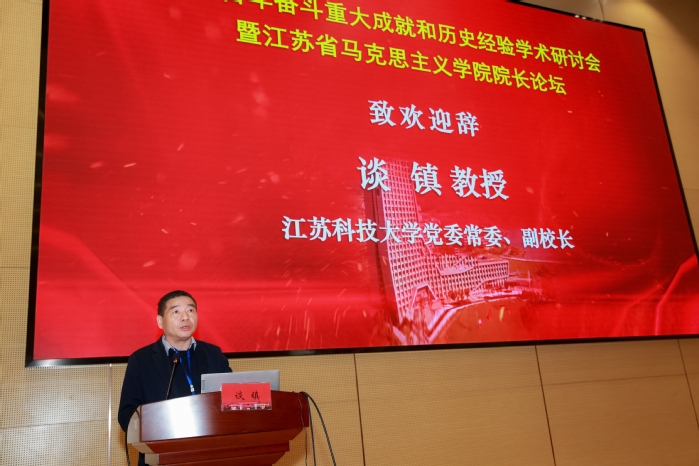 江蘇科技大學校黨委常委、副校長談鎮教授致歡迎辭。他向參會嘉賓詳細介紹了江蘇科技大學的辦學歷史、辦學特色、服務國家重大戰略情況,表示學校圍繞“把馬克思主義研究和宣傳的氛圍搞得濃濃的、讓馬克思主義旗幟高高飄揚”的目標,切實加強了馬克思主義學院建設。