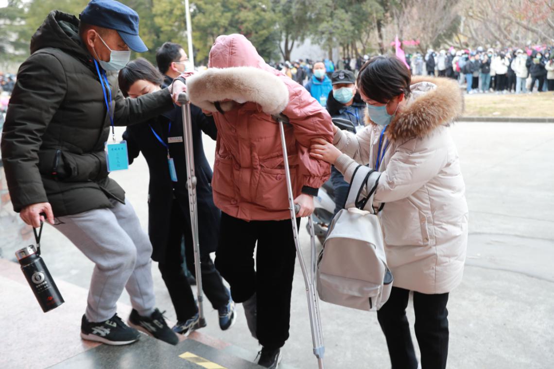 一考生因腳受傷,被工作人員攙扶入場(chǎng)