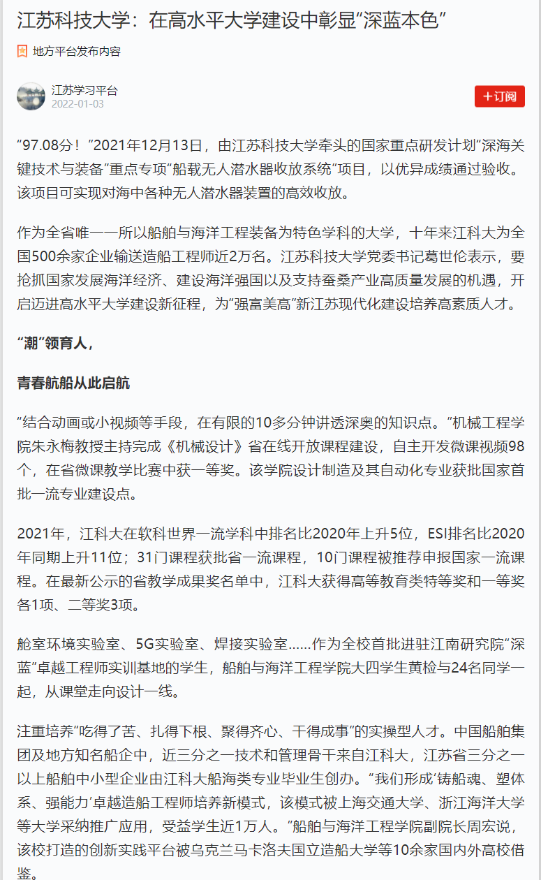 大力開展校地合作,讓江科大與鎮江“同頻共振”。位于鎮江高新區的江蘇科技大學海洋裝備研究院,與鎮江高新區攜手并進,先后承擔省部級及以上項目43項,項目總經費達2.69億元。