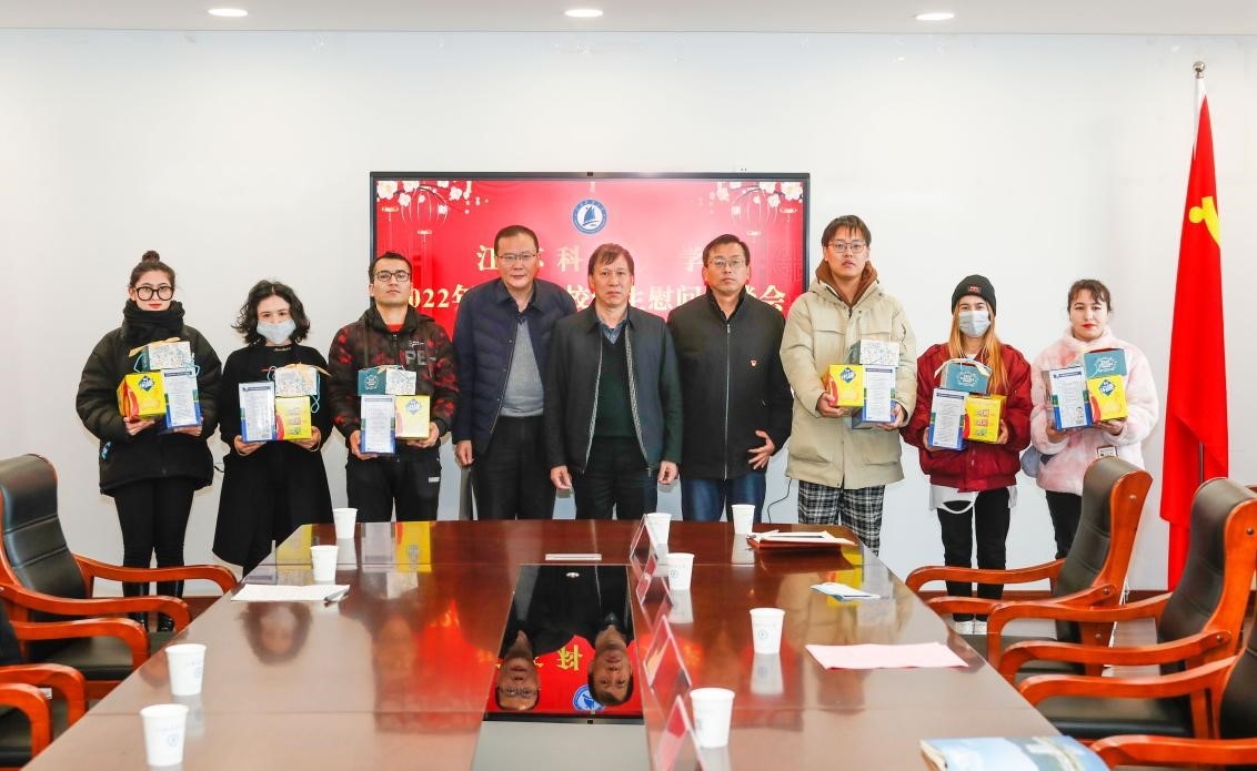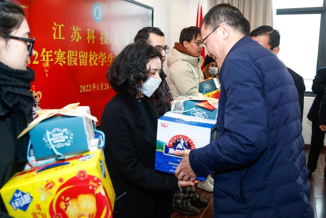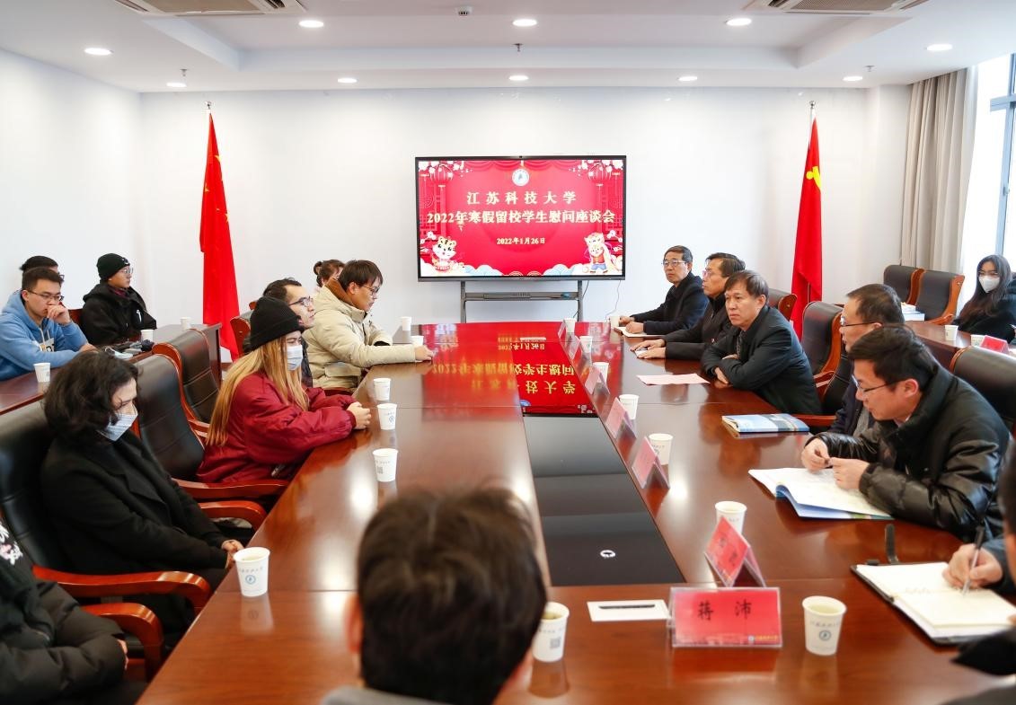 愛心驅寒意,溫情暖人心。隆冬歲末的室外嚴寒凜冽,江蘇科技大學行政樓8樓會議室里卻洋溢著濃濃的暖意。1月26日上午,該校黨委書記葛世倫,黨委常委、副校長湯建,鎮江市高校園區建設指揮部副總指揮馬士良,高校投資集團副總經理蔣沛看望慰問留校學生,了解留校學生學習生活情況,有針對性地給予指導和幫助,并贈送慰問禮包。