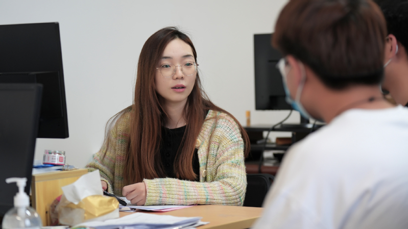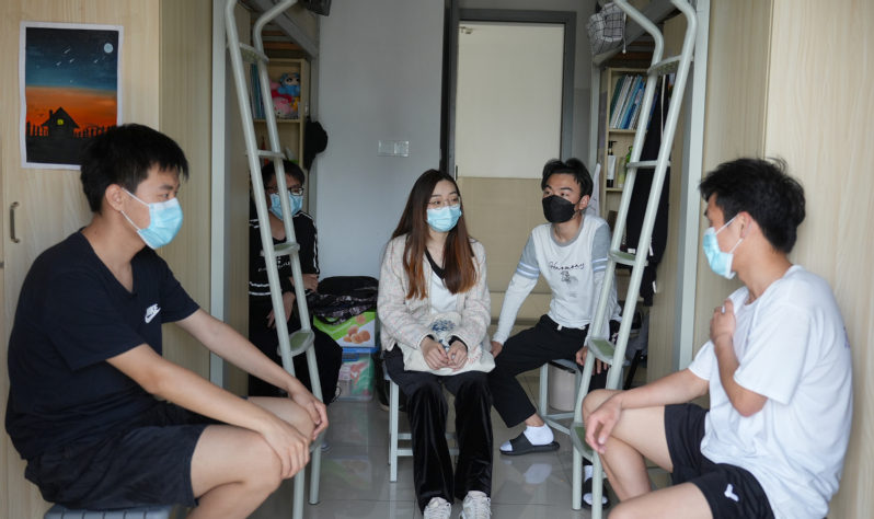 電子信息學院輔導員曹夢瑤同樣也是同學們的“知心姐姐”。學校食堂在封閉管理期間不能堂食,曹夢瑤的辦公室也離學生公寓較遠,為了便于與學生展開談話,曹夢瑤買好飯帶到學生宿舍,在那里“速戰速決”后再與學生促膝長談。