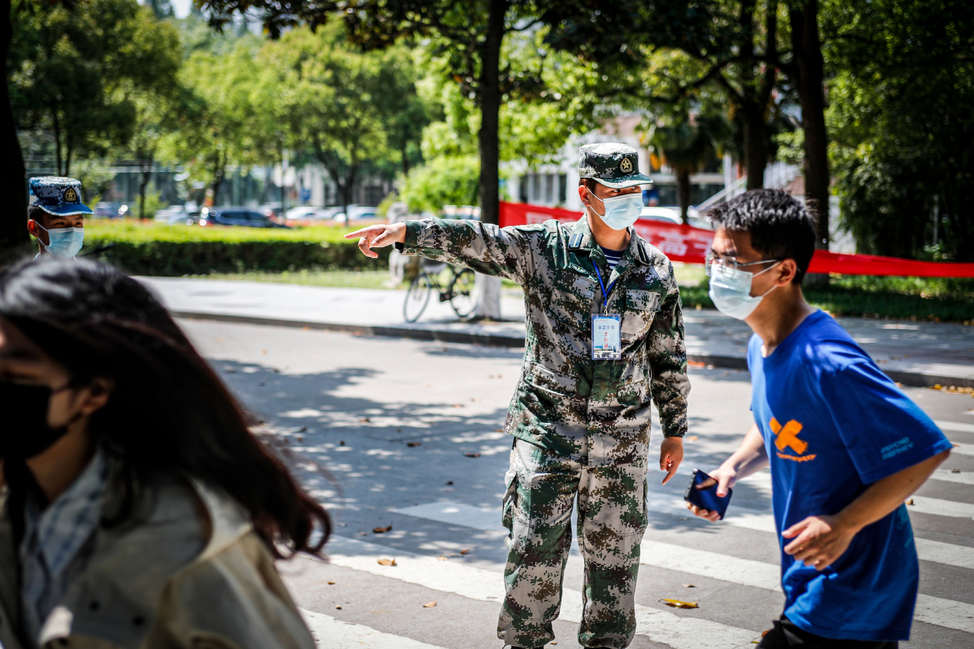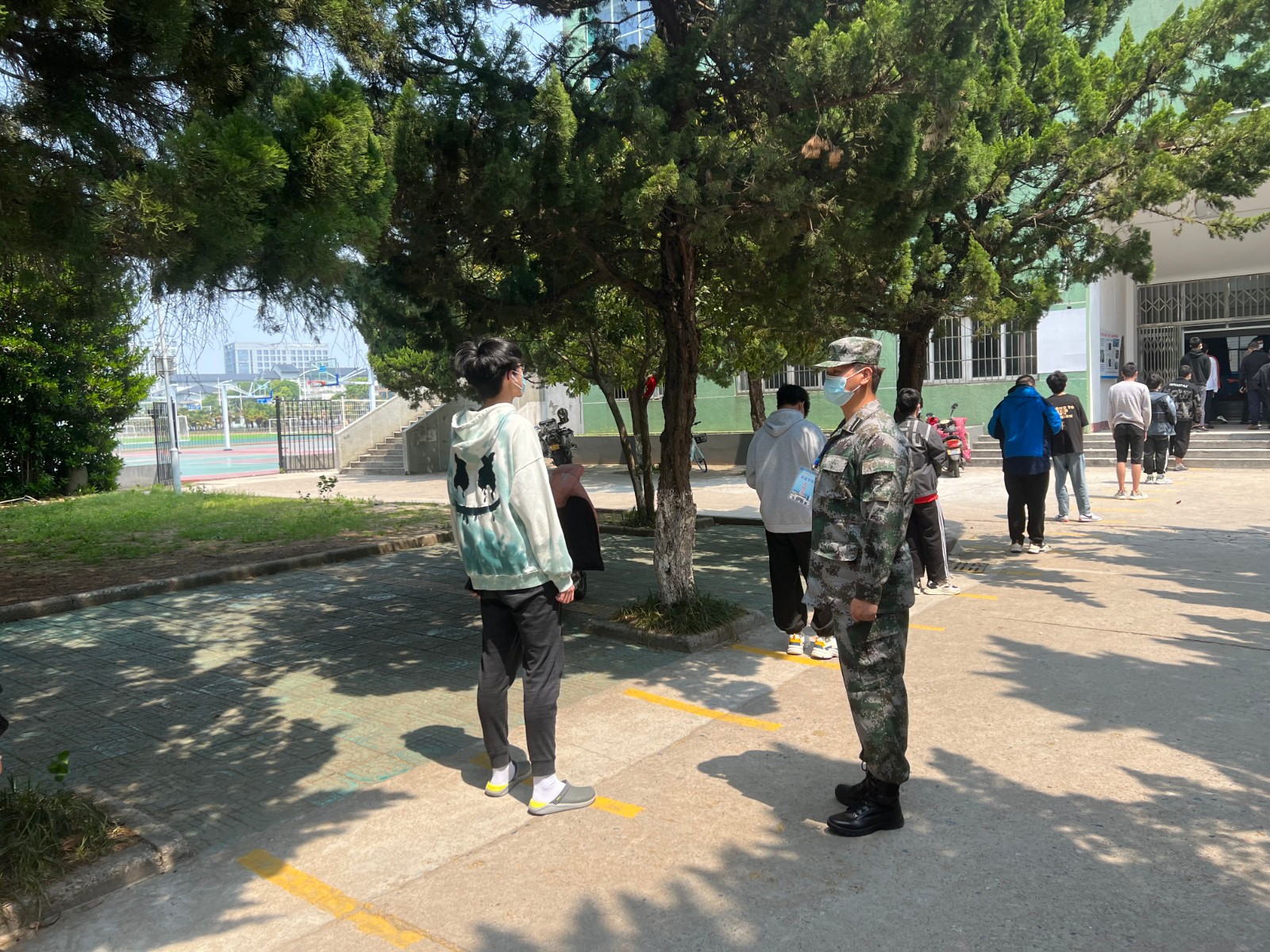 4月13日那天下起了傾盆大雨,學(xué)校常規(guī)核酸監(jiān)測照常進行。梅玟煜在隊伍間來回走動維持秩序,雨水和車輛濺出的水花把衣服鞋子都打濕了。隊伍雖然只有兩百多米長,梅玟煜當天卻走了兩萬多步。雨天執(zhí)勤讓他回想起在某部警衛(wèi)連執(zhí)行野外任務(wù),“雖然艱苦異常,但內(nèi)心的責(zé)任感會讓我堅守到最后一刻。” 當天雨中執(zhí)勤的還有董昶,在某部遠程火箭炮營服役時,曾多次赴酒泉和各島嶼參加重大作戰(zhàn)演習(xí)任務(wù)。“衣服全都濕了也沒辦法,我們是一定要先把任務(wù)完成再回去的。” 董昶說兩人回去后,第一時間在群里報告雨天執(zhí)勤情況,提醒雨天要提前設(shè)置一些路障,讓車輛有序流動;一定要用比較和善的語氣,盡量讓大家理解工作目的等。