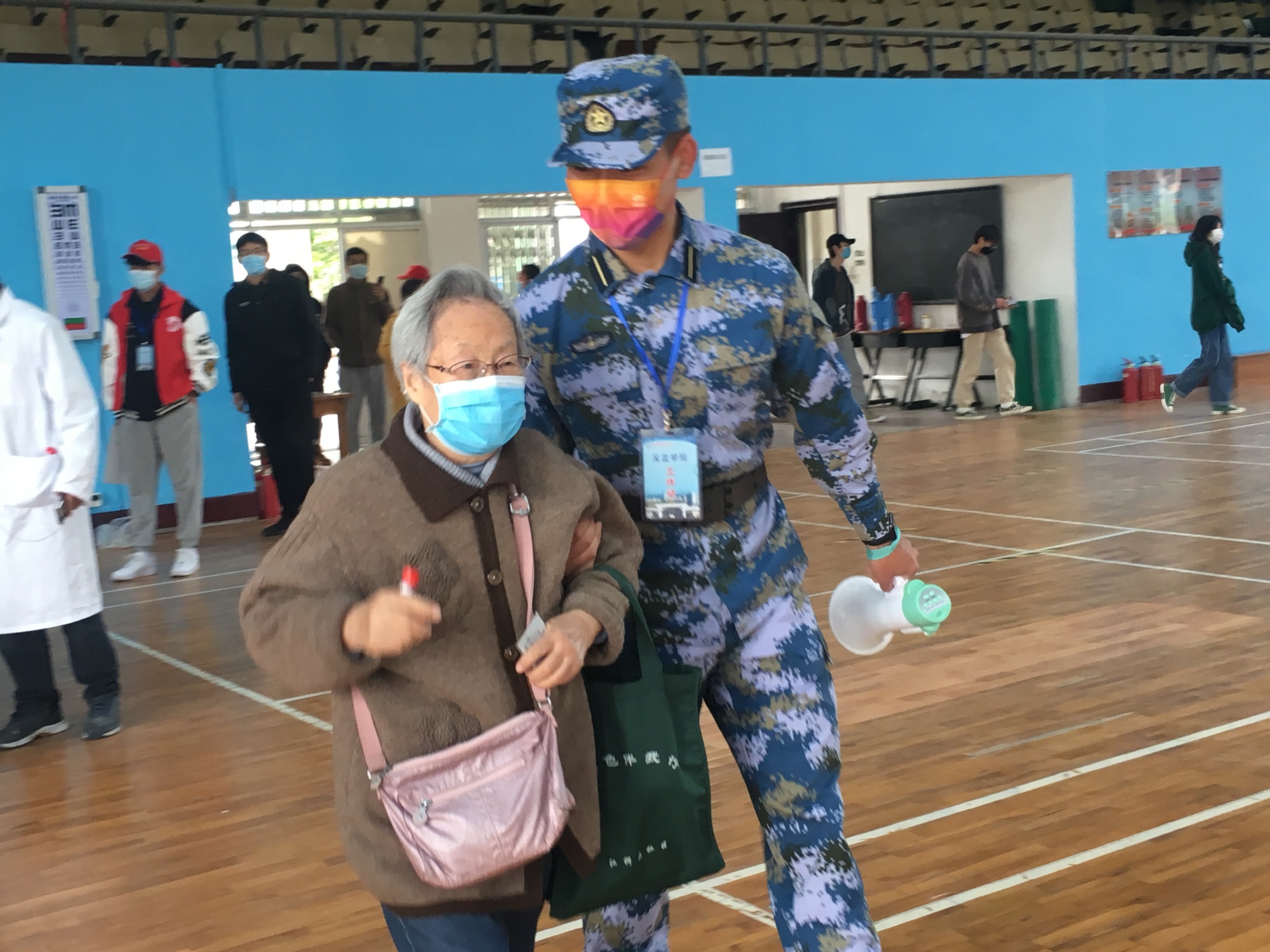 4月17日,最先被老師同學(xué)“曝光”的是嚴凌。這名帥小伙2019年9月入伍,曾任中國人民解放軍某部副班長,目前是學(xué)校深藍學(xué)院2021級電氣工程及其自動化專業(yè)學(xué)生。“看到行動不便的老奶奶,本能地去扶了一把,沒想到有人把我這一舉動拍了下來,還發(fā)到朋友圈。”在核酸檢測現(xiàn)場,嚴凌多次遇到那位81歲高齡的退休老教師。因為老人腿腳不便,嚴凌就干脆一路攙扶著她,陪同排隊并且完成核酸采集。“老奶奶跟我奶奶一樣都姓管,非常親切,還會主動關(guān)心我的學(xué)習(xí),問我志愿服務(wù)累不累,還給我講訴了很多學(xué)校故事,是江科大發(fā)展歷程的參與者和見證者。當我站立執(zhí)勤很累的時候,想起老前輩就深感力量倍增”。