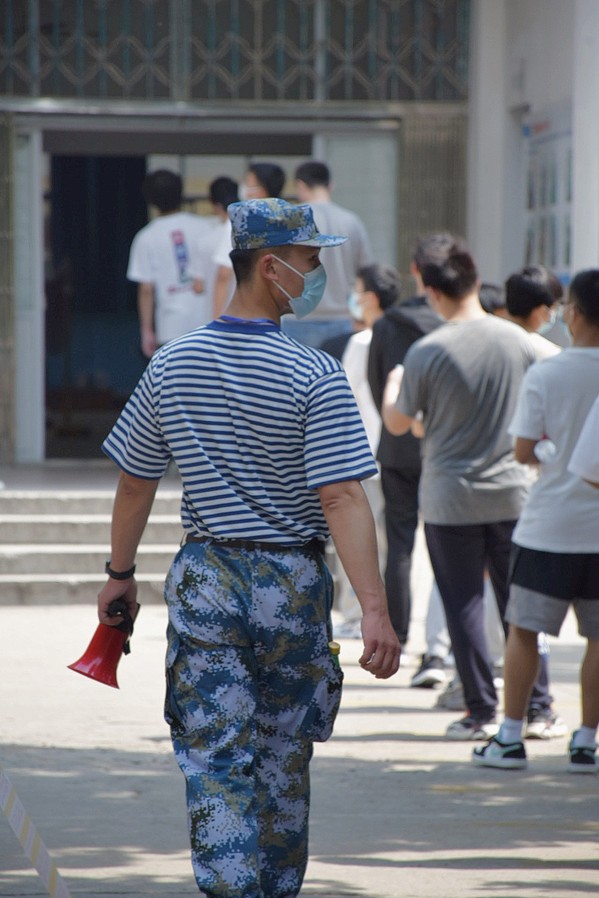 “別跑別跑,走就行了。保持距離,站在線上。”看到前方隊伍出現(xiàn)一長段空白,心急的同學(xué)忍不住跑步向前,肖蕓樹當即雙手握拳收縮在側(cè)大步流星追上,同時穩(wěn)定發(fā)聲安撫情緒。曾經(jīng)服役于武警某部的他,做過特種作戰(zhàn)狙擊手,作風(fēng)沉穩(wěn)剛勁。陳健和吳振坤介紹,每天大家重復(fù)最多的話是“戴好口罩,保持2米距離”“請準備好身份證,謝謝大家的配合。”看似簡短,實則經(jīng)過隊員們不斷打磨。
