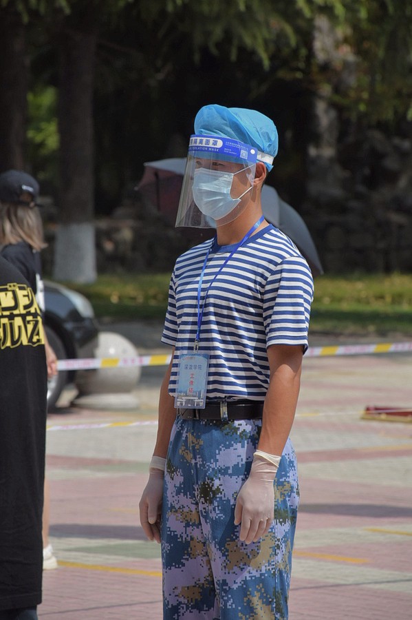 第一輪全員核酸檢測時,朱森淼第一次穿上了防護服,成了一名全副武裝的“大藍”。那天室外溫度超過25℃,汗水蒸發(fā)讓朱森淼的面罩起了一層霧,“都沒辦法看清。從迷彩到大藍,責(zé)任是一樣的,同樣是在一線為大家服務(wù)。我會把每一次執(zhí)勤都當做特別的任務(wù)對待。”小組成員王俊才告訴記者,“全員核酸的時候站立要達到6個小時以上,特別辛苦也特別累,但是想一想能為學(xué)校出一份力,又會把腰桿挺得更直。”