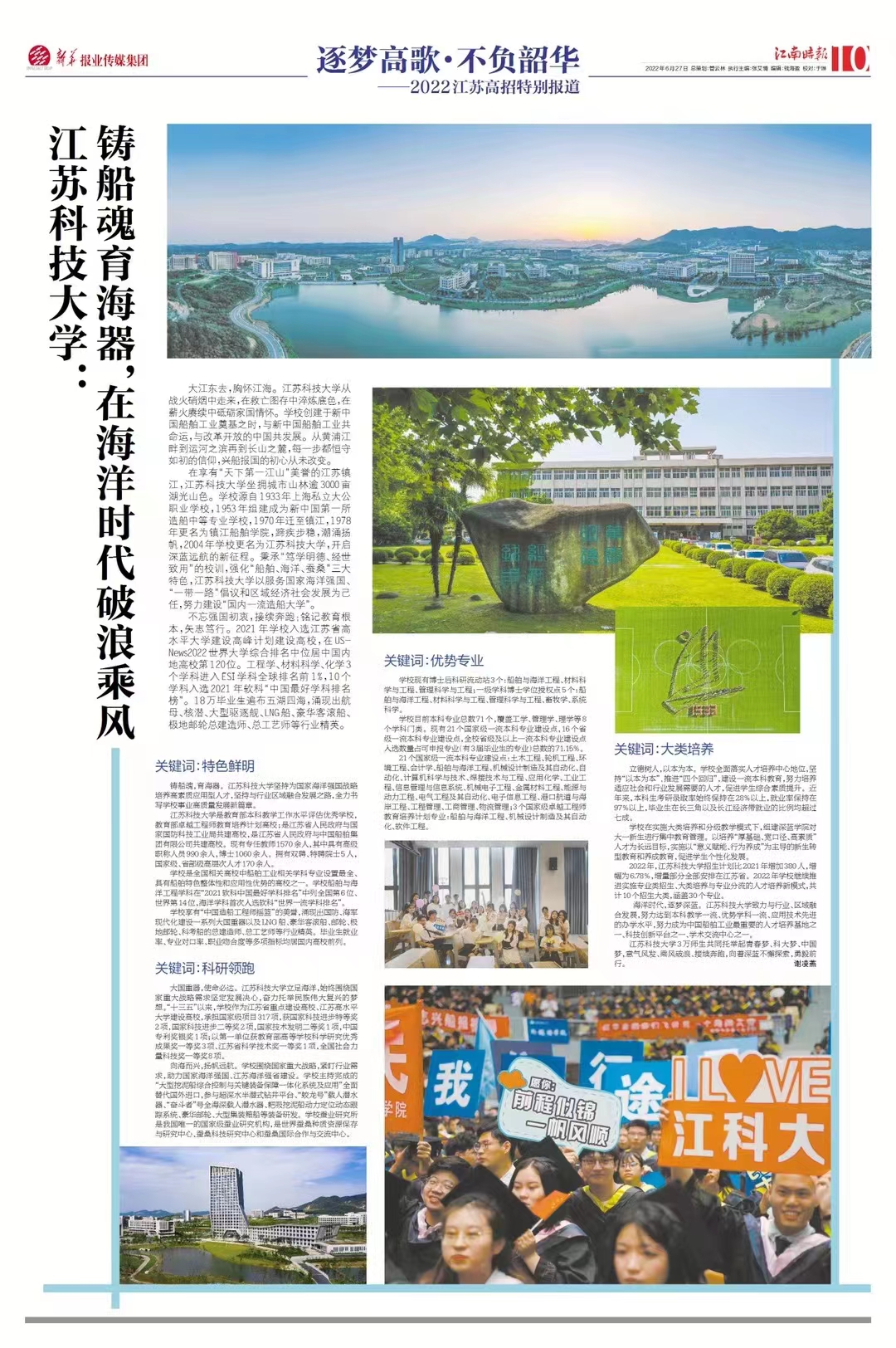 鑄船魂,育海器。江蘇科技大學(xué)堅持為國家海洋強國戰(zhàn)略培養(yǎng)高素質(zhì)應(yīng)用型人才,堅持與行業(yè)區(qū)域融合發(fā)展之路,全力書寫學(xué)校事業(yè)高質(zhì)量發(fā)展新篇章。
