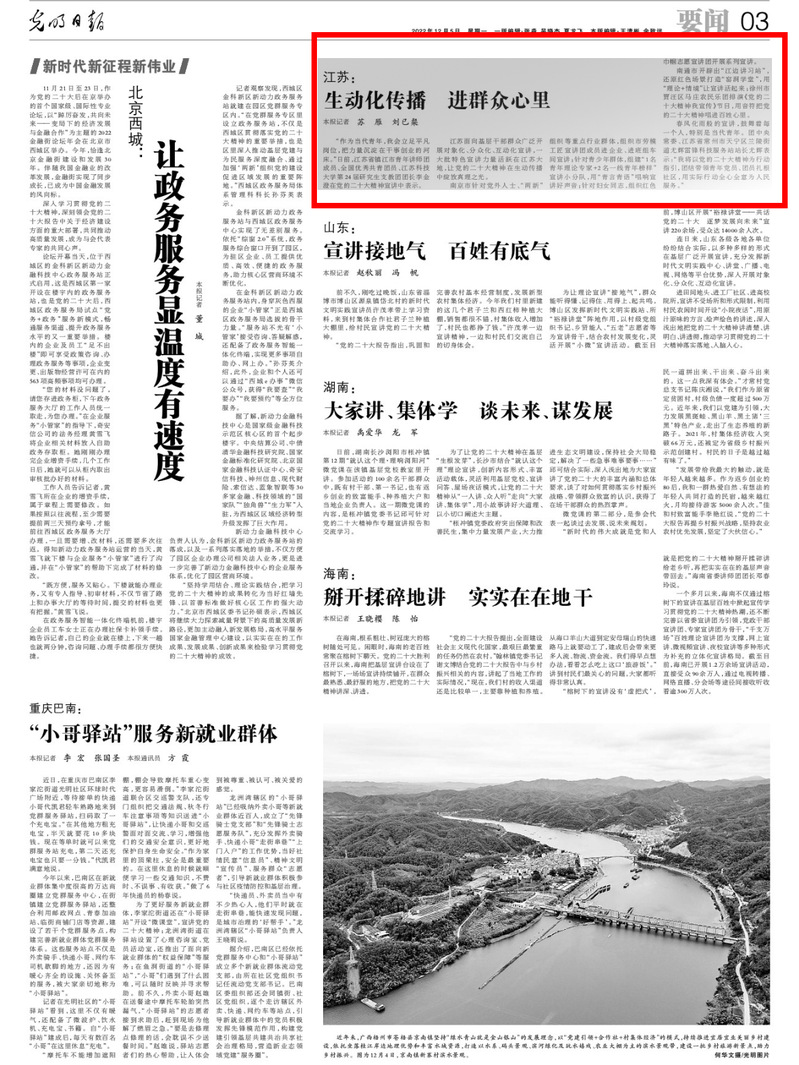 江蘇面向基層干部群眾廣泛開展對象化、分眾化、互動化宣講,一大批特色宣講力量活躍在江蘇大地,讓黨的二十大精神在生動傳播中綻放真理之光。