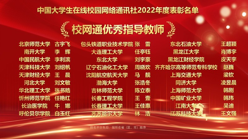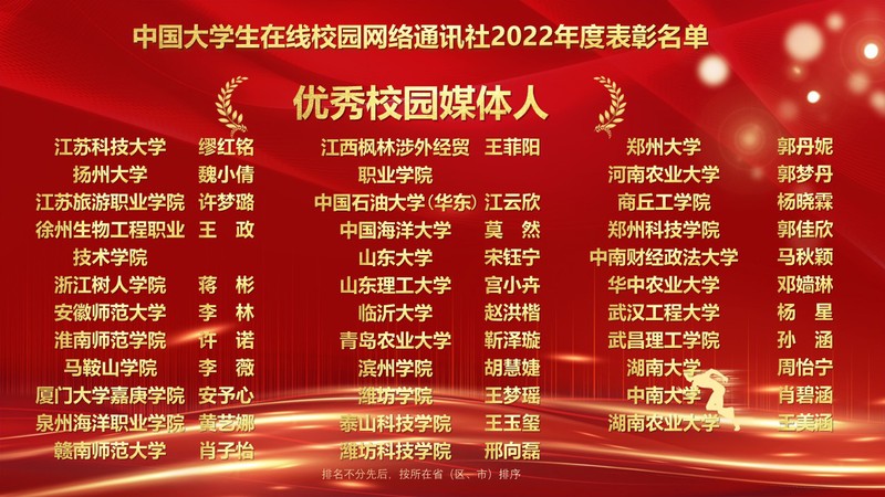 1月10日,教育部中國大學生在線“2022校園號建設暨校網通工作年會”在北京召開,會議對2022年校園網絡通訊站及校園行活動進行了表彰,來自全國高校的指導教師和學生代表線上參會。我校黨委宣傳部融媒體中心校園網絡通訊站從全國600余個校園網絡通訊站中脫穎而出,榮獲“優秀校園網絡通訊站”、校園行活動“優秀組織單位”,黨委宣傳部王文強老師榮獲“優秀指導教師”,繆紅銘同學榮獲“優秀校園媒體人”稱號。