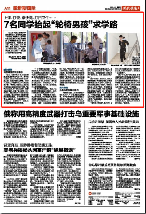 在江蘇科技大學海洋學院的教室后排,靜靜地擺放著一張輪椅。輪椅是大三學生陳帆的,他因患先天性肌肉萎縮癥,日常要靠輪椅出行,學習生活多有不便。幸運的是,張興韌、尹鳴、王胤凱、王銘、梁健闖、郭磊、趙湘東7名同學成了他的好朋友,上課、打飯、拿快遞、打掃衛(wèi)生……他們合力“抬起”陳帆的求學路。