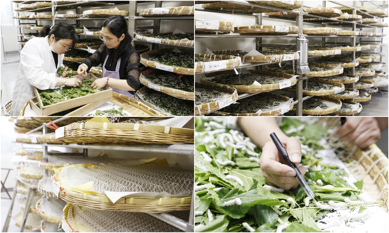 進入蠶研所明亮齊整的蠶室,可以查看到精心保育有的1100余份種質資源,包括家蠶地方種、國外引進種、改良種、突變基因、種質創新材料、育種素材及蓖麻蠶等種質資源。涉及化性、眠性、斑紋、體色、大小等各異的家蠶,正在不同的蠶匾里“沙沙”地吃著桑葉,然后吐絲、結繭、化蛾、產卵,將基因代代相傳,形成國家蠶種質資源庫。