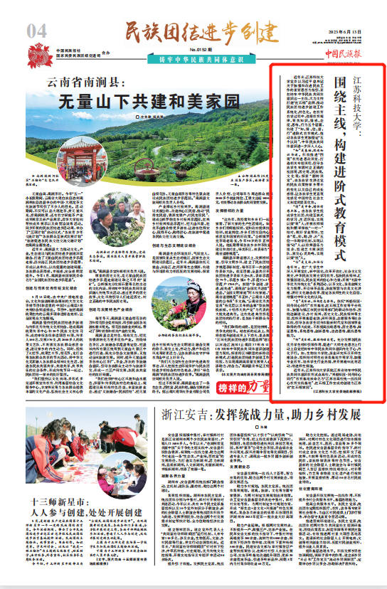 近年來,江蘇科技大學獲批江蘇省鑄牢中華民族共同體意識教育試點高校,“興船報國·同舟同心同行”教育基地被命名為“江蘇省高校統(tǒng)一戰(zhàn)線同心教育實踐基地”,紅石榴工作室成功創(chuàng)建為江蘇省“紅石榴家園”。(江蘇科技大學黨委統(tǒng)戰(zhàn)部供稿)