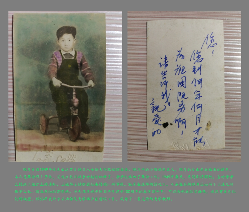 我的父親在抗日戰(zhàn)爭時(shí)犧牲,母親也參加了革命工作。1949年無錫解放前夕,母親在我的照片后留下遺筆:“您!您到何年何月才能為祖國服務(wù)啊!請告訴我,親愛的。”作為革命烈士的后代,是黨和人民培養(yǎng)我成為一名大學(xué)教師,為人民服務(wù)是我的宗旨,振興中華是我的人生信念。