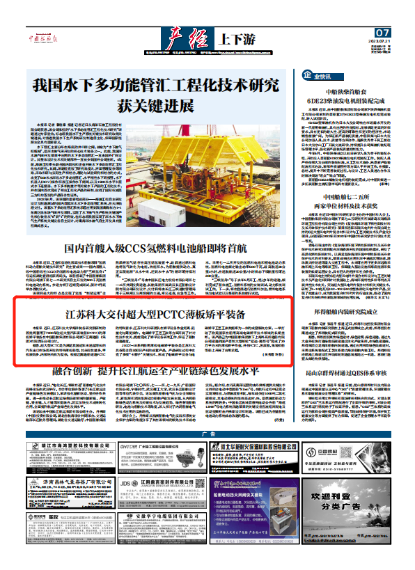 本報訊 近日,江蘇科技大學海洋裝備研究院研制的首批兩套用于7600車位超大型汽車滾裝船(PCTC)的薄板矯平裝備在中國船舶集團有限公司旗下江南造船(集團)有限責任公司交付。