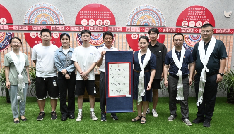 平措對江蘇科技大學(xué)給予的關(guān)心和支持表示感謝,為參加活動的老師們獻上潔白的哈達,給積極參加支教的蔣薇薇老師贈送藏文書法作品“潛心支教 大愛無疆”。