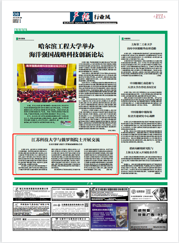 本報訊 近日,應江蘇科技大學船舶與海洋工程學院邀請,俄羅斯遠東聯邦大學亞歷山大·貝克院士前往該校參加國際合作交流會議。此次交流加強了中俄在海事技術及交通領域的科技合作,達成了合作意向,拓寬了該校冰區船舶與海洋工程裝備的科研方向,并將推動該校更好地參與中俄科技創新戰略性合作等國家級重點項目,服務國家“海洋強國”戰略,為國家“冰上絲綢之路”建設進一步提供科技保障。