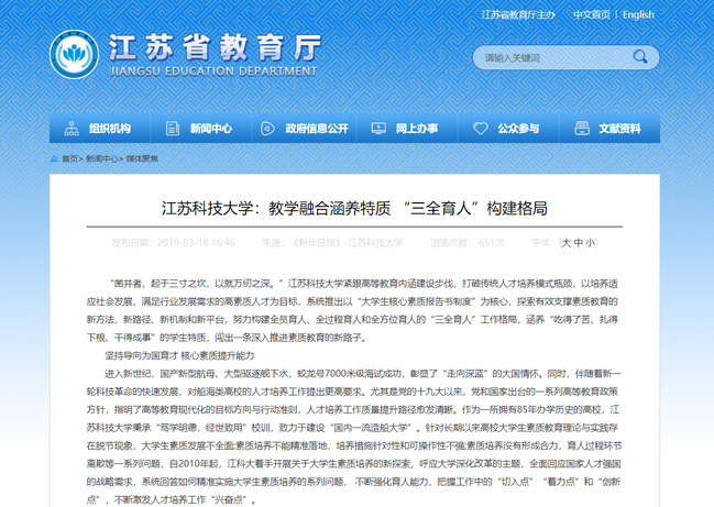 江蘇省教育廳《江蘇科技大學教學融合涵養特質 “三全育人”構建格局》(2019年3月18日)