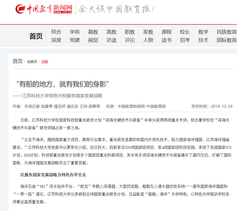 中國教育新聞網《“有船的地方,就有我們的身影”——江蘇科技大學特色興校服務國家發展戰略》(2018年12月24日)