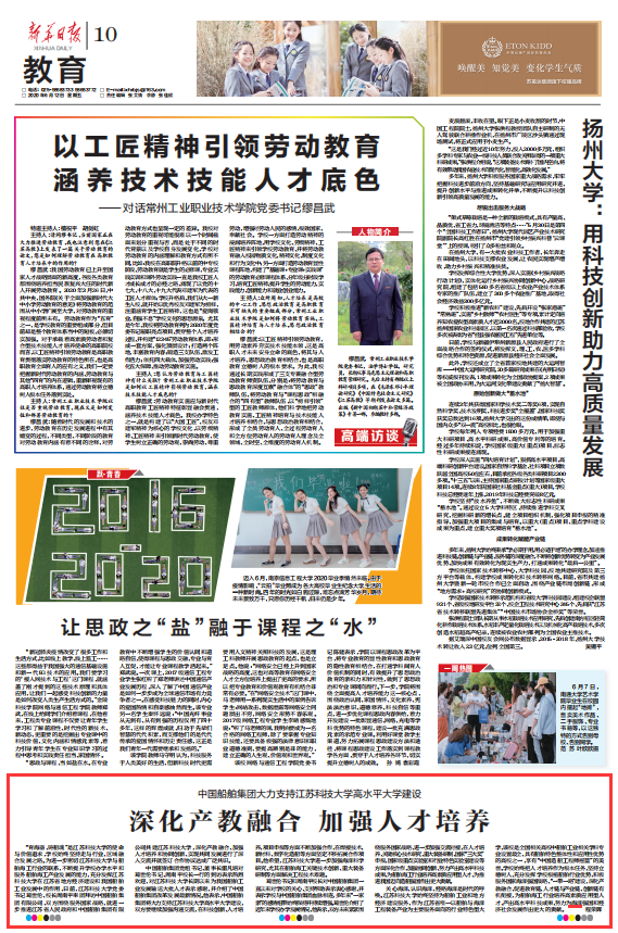 新華日報《中國船舶集團大力支持江蘇科技大學高水平大學建設--深化產教融合 加強人才培養》