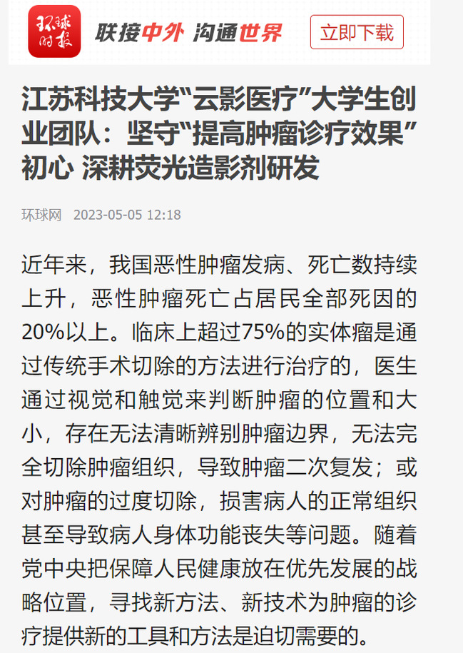 環球時報《江蘇科技大學“云影醫療”大學生創業團隊:堅守“提高腫瘤診療效果”初心 深耕熒光造影劑研發》(2023年5月5日)