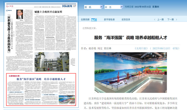 光明日報《江蘇科技大學 服務“海洋強國”戰略 培養卓越船舶人才》(2022年9月15日)