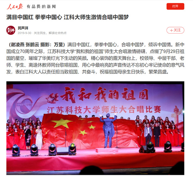 人民日報《滿目中國紅 拳拳中國心 江科大師生激情合唱中國夢》(2019年9月30日)
