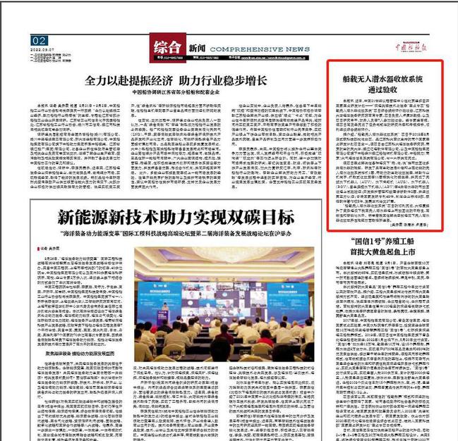 中國船舶報《船載無人潛水器收放系統通過驗收》(2022年9月7日)
