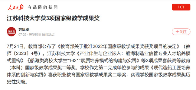人民日報《江蘇科技大學獲3項國家級教學成果獎》(2023年7月26日)