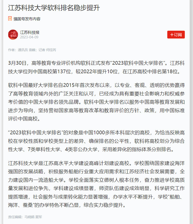 學習強國《江蘇科技大學軟科排名穩步提升》(2023年4月9日)