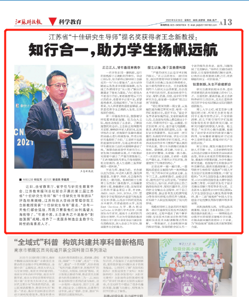 江蘇科技報《江蘇省“十佳研究生導師”提名獎獲得者王念新教授:知行合一,助力學生揚帆遠航》(2022年9月30日)