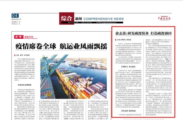 中國船舶報《俞孟蕻:研發疏浚裝備 打造疏浚強國》(2020年4月10日)
