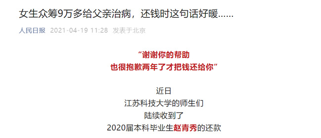 人民日報《女生眾籌9萬多給父親治病,還錢時這句話好暖》(2021年4月19日)