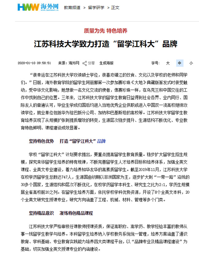 人民日報(海外網)《江蘇科技大學致力打造“留學江科大”品牌》(2020年1月10日)